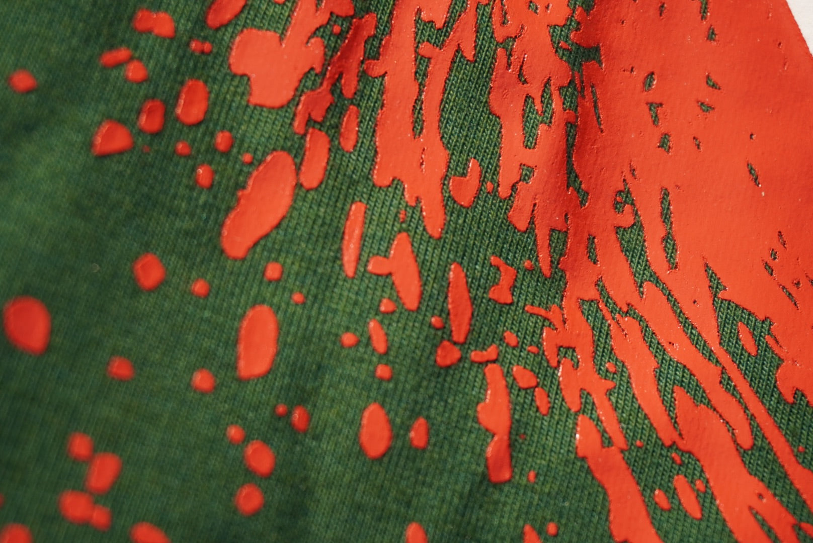 For printing we used two printing methods. Screen print method which is smooth, levelled with the textile surface and puff print which absolutely stands out.